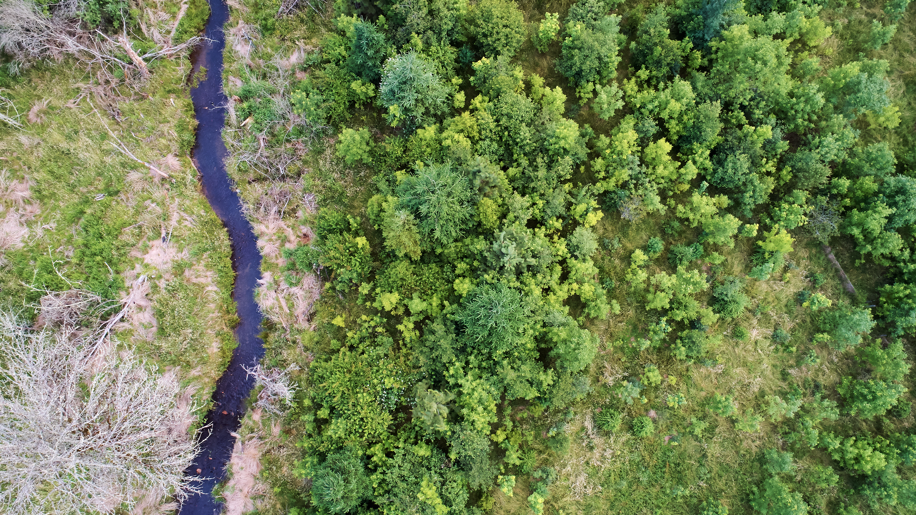 - An aerial view of restoration efforts along Johnson Creek on the property