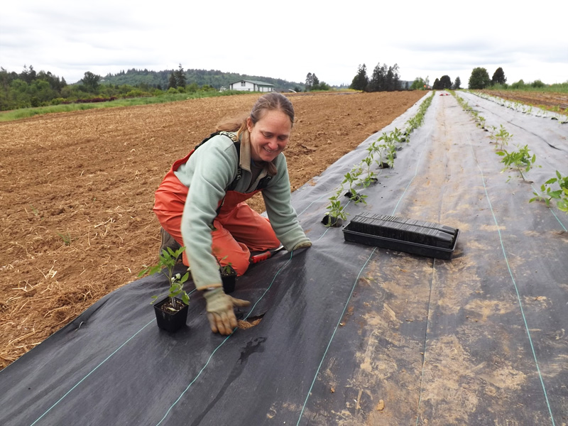 Headwaters-farm-tour-4 ← Previous Emily Cooper of Full Cellar Farm planting tomatoes in nursery fabric, a durable and reusable material that is effective for suppressing weeds.