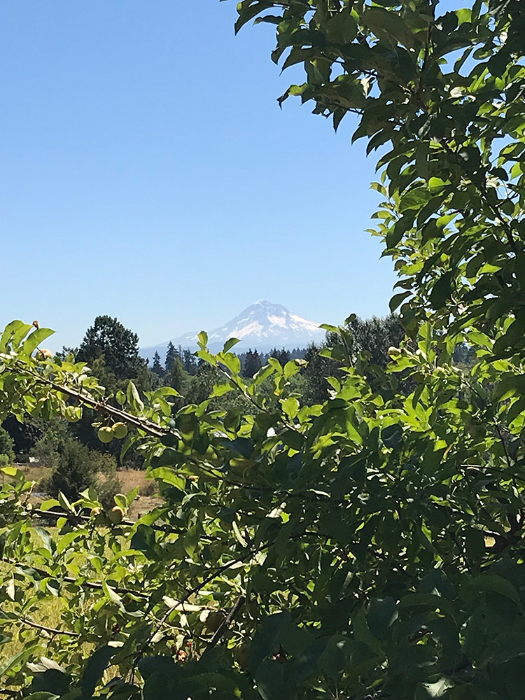 The orchard at Mainstem Farm frames a view of Mt. Hood