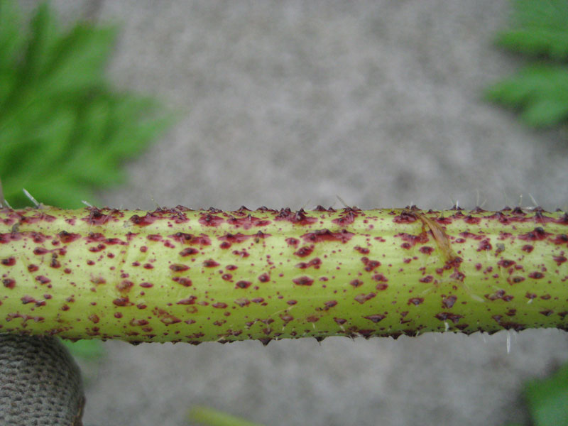 Giant hogweed stem ← Previous Next → Hogweed stalks are bumpy, hollow, 2-4 inches wide and have deep red to purple blotches and erect bristles.
