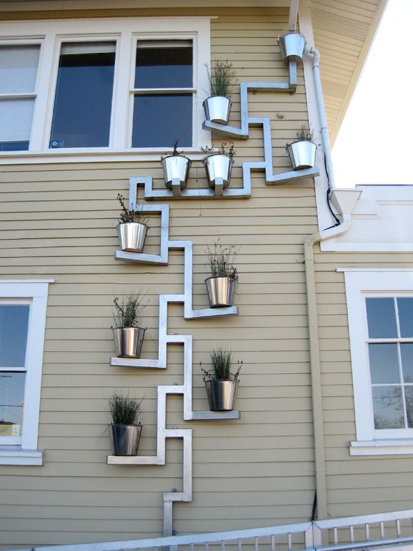 Bucket Brigade Downspout planter ← Previous Next → Water runoff works its way down to each plant in our “Bucket Brigade” downspout planter