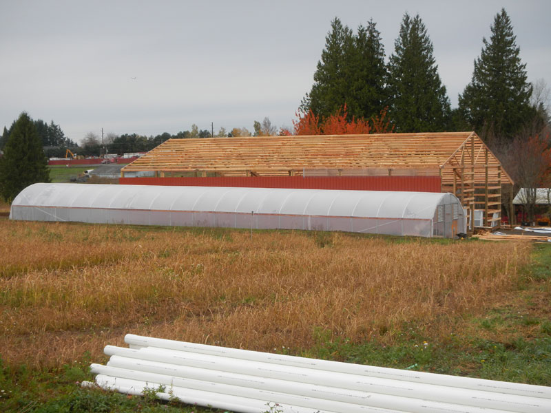 Barn construction continues ← Previous Next → The first pieces of metal siding are placed on the barn