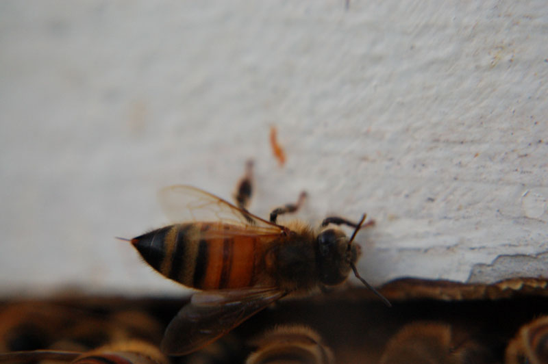 Honeybee in hive ← Previous Next → A honeybee on the surface of its hive. This year, we had twenty-eight hives. Photo courtesy Rick Reddaway