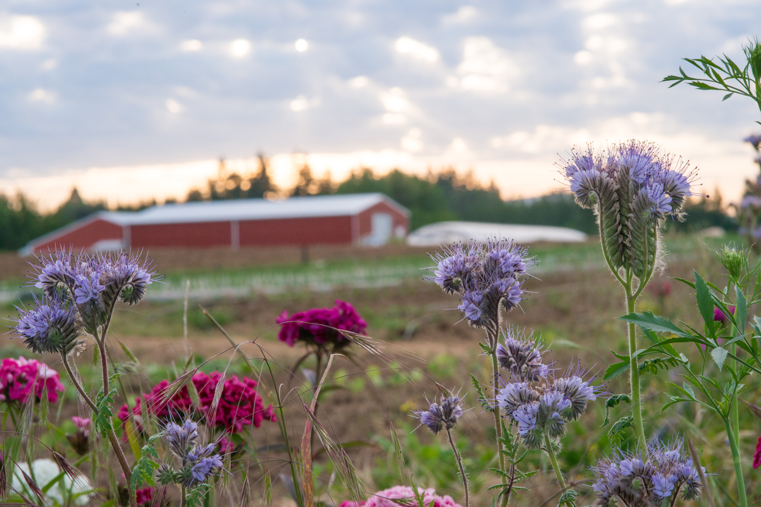 Headwaters Farm – field and flowers ← Previous Next → A pollinator row flanks fields at Headwaters Farm