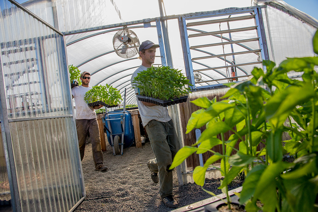 Black Locust Farm farmers pull flats of peppers out of the prophouse. Photo credit Chelsea Rutherford.